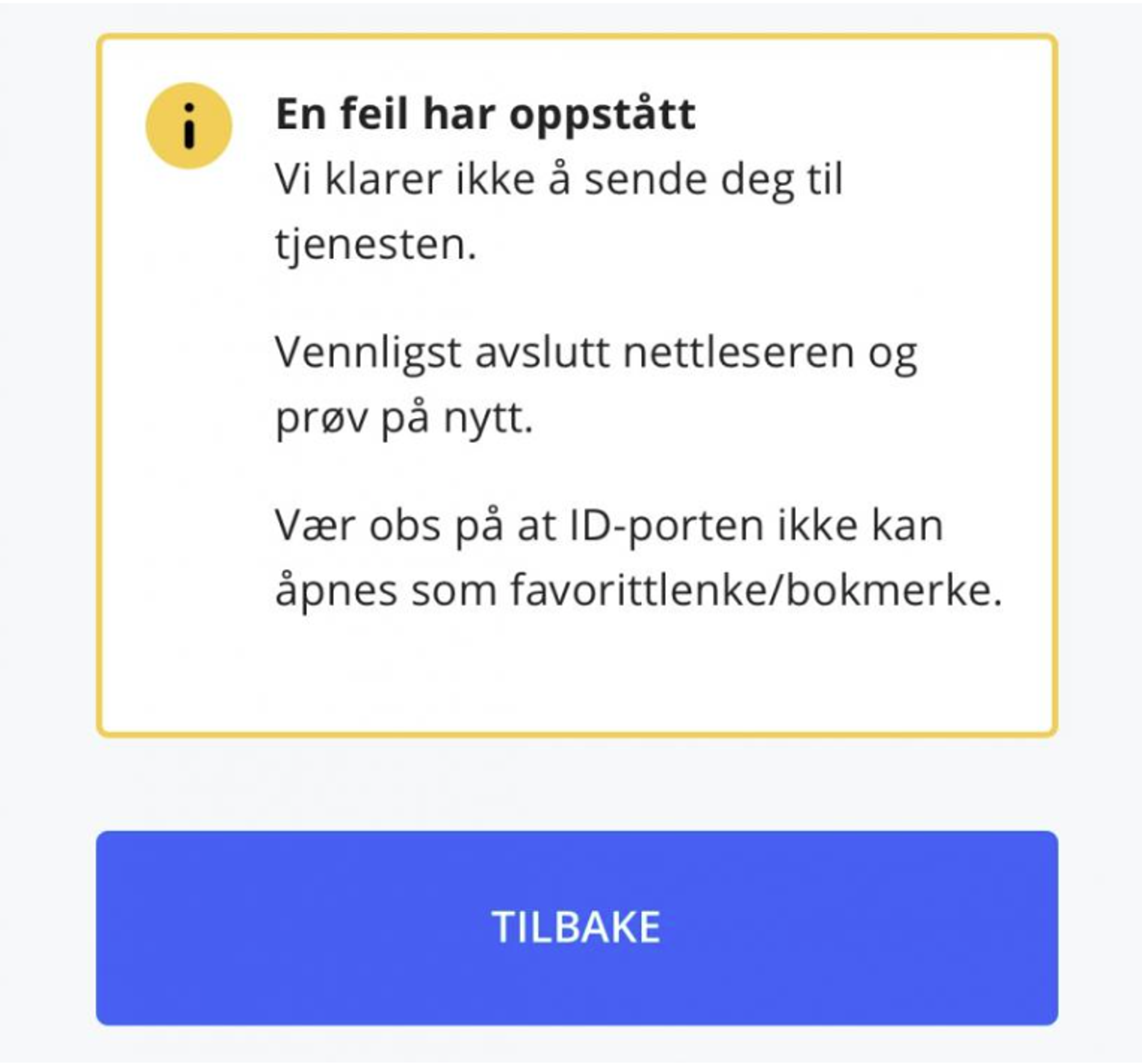 Mulige løsninger kan da være: slette informasjonskapsler og nettleserhistorikk, benytte «inkognito-modus» eller forsøke en annen nettleser. Min Side støtter bruken av alle nettlesere.